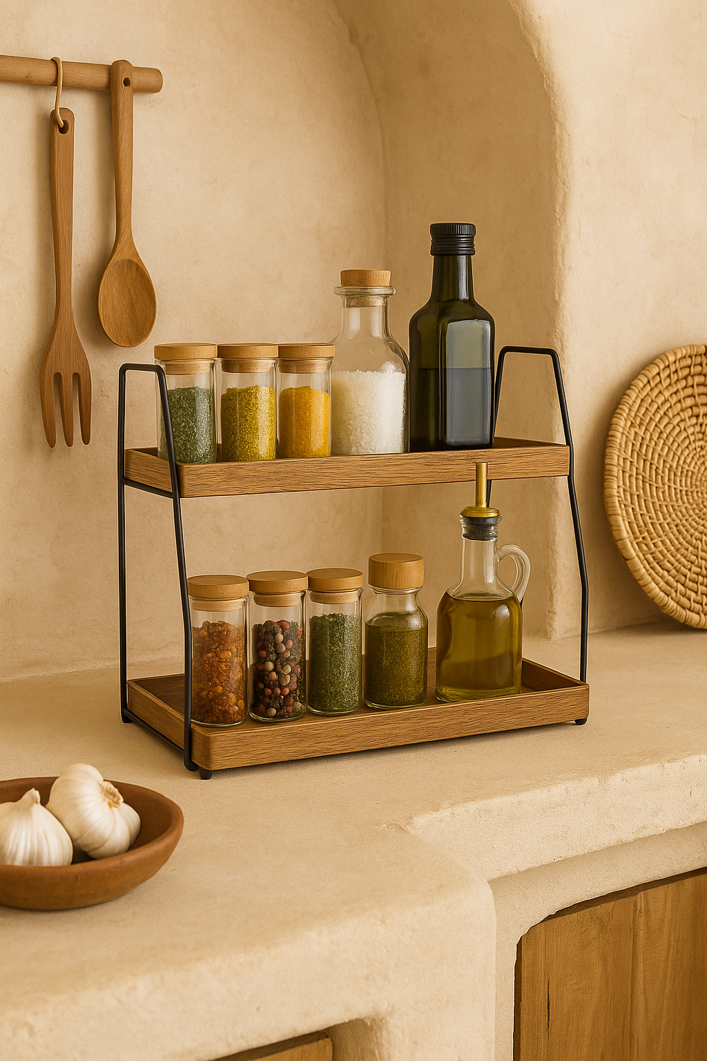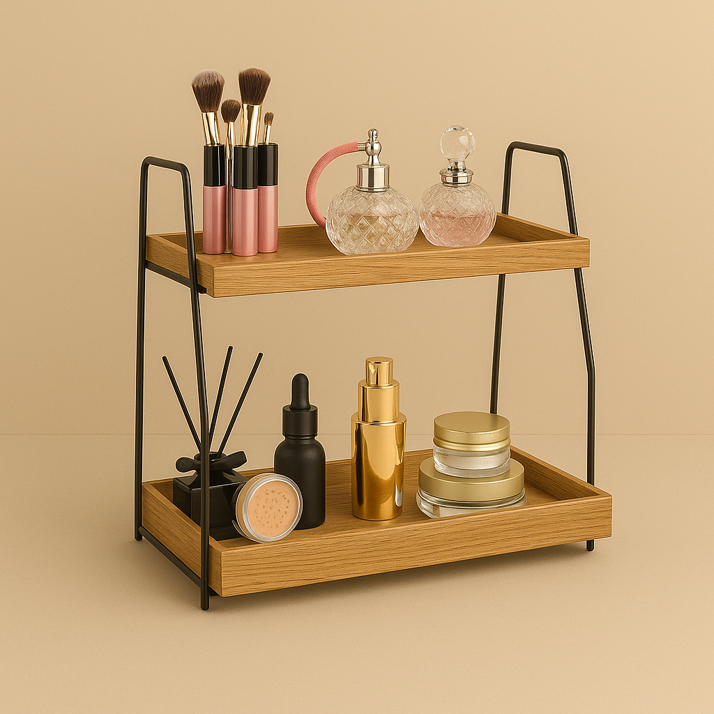 Breng orde en stijl in huis met de Zenju Double – Opbergrek. Dit functionele en elegante rek is 33 cm hoog en 35.5 cm breed en gemaakt van een combinatie van hout en bamboe. Dankzij het minimalistische design en het duurzame materiaal past dit 2-laagse opbergrek perfect in badkamer, keuken, woonkamer of op je bureau.